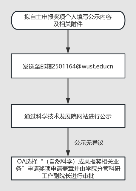 公示内容请发送至邮箱2501164@wust.edu.cn,并备注联络人及联系方式,同时需以PDF附件形式呈现报奖项目基本情况,具体内容必须严格按照奖励申报要求提供(如申报要求未明确公示内容,应包括但不限于:项目名称、完成单位、完成人、项目简介、主要知识产权目录等内容)。提交公示材料前请认真检查,一经公示,不予修改。